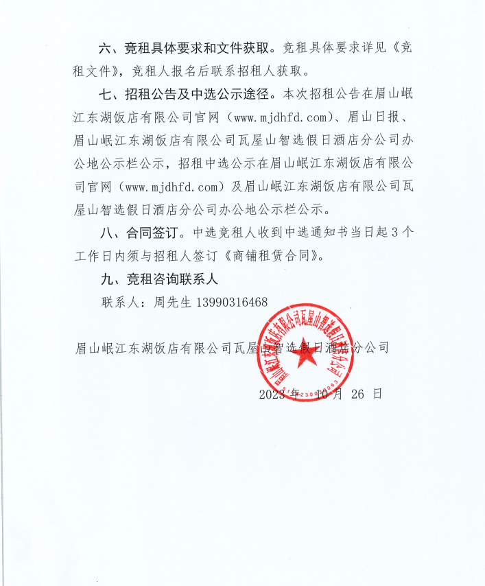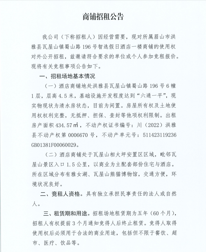 眉山岷江東湖飯店有限公司瓦屋山智選假日酒店分公司商鋪招租項(xiàng)目