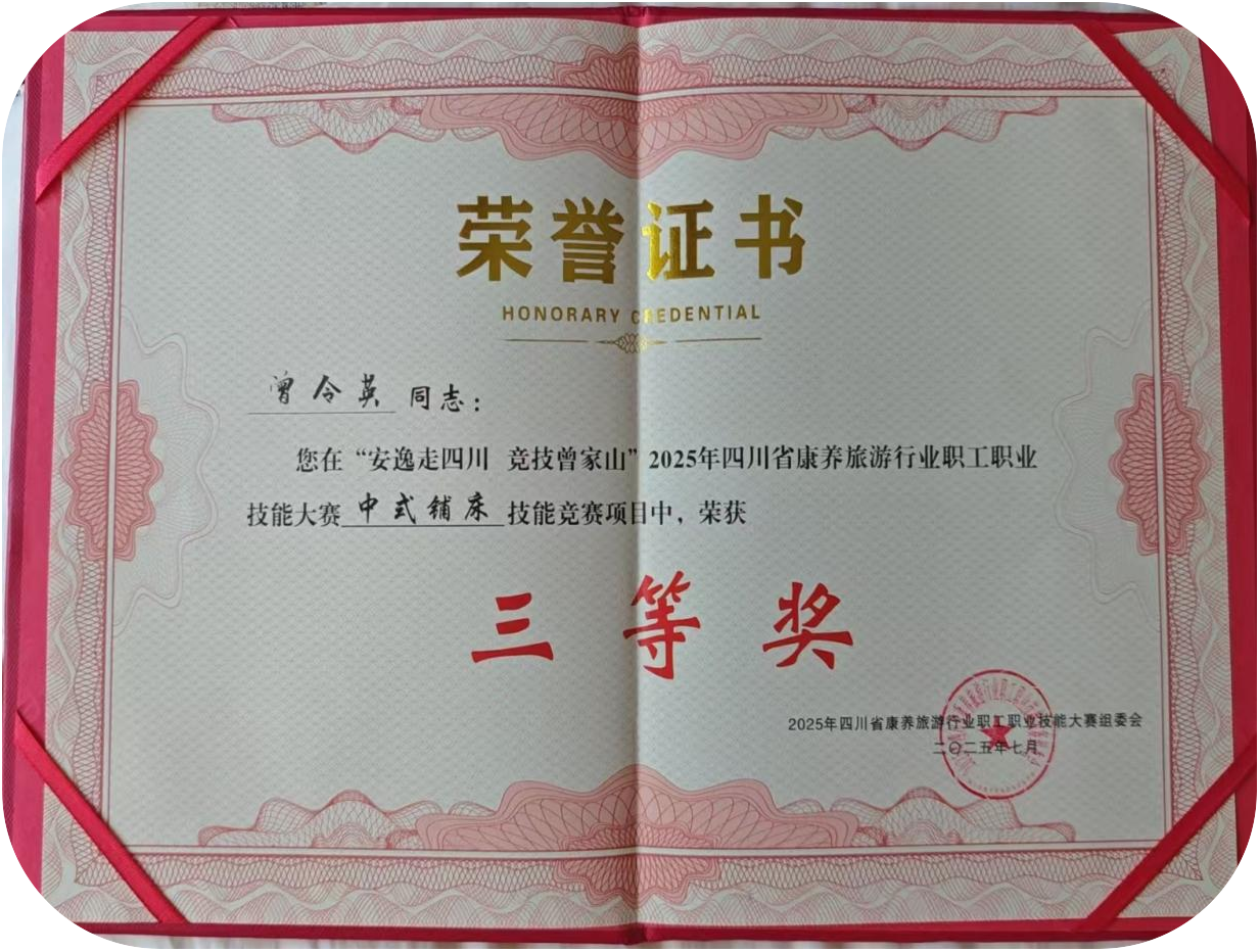 近日,由四川省總工會(huì)、省人力資源和社會(huì)保障廳、省文化和旅游廳及廣元市人民政府聯(lián)合主辦的“2025年四川省康養(yǎng)旅游行業(yè)員工職業(yè)技能大賽”在廣元市圓滿落幕。岷江東湖飯店積極選派優(yōu)秀員工參賽,經(jīng)過激烈角逐,最終斬獲中式鋪床項(xiàng)目個(gè)人三等獎(jiǎng)(曾令英)及團(tuán)體三等獎(jiǎng),以扎實(shí)的技能水平與專業(yè)的服務(wù)素養(yǎng),在全省康養(yǎng)旅游行業(yè)同仁中展現(xiàn)了“東湖風(fēng)采”。