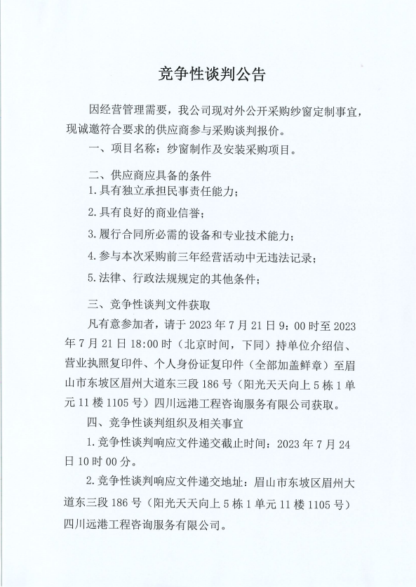 瓦屋山雲(yún)岸度假酒店分公司紗窗制作及安裝 競爭性談判公告